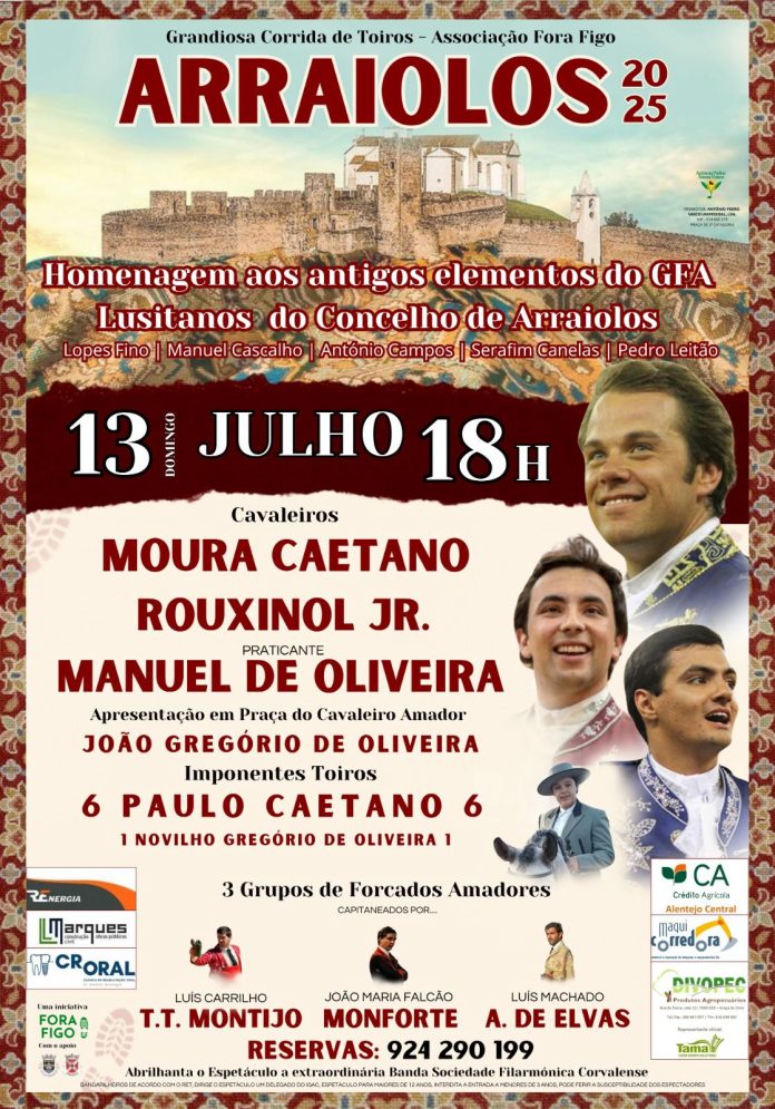 No dia 13 de julho de 2025, às 18h, Arraiolos será palco de uma corrida de toiros promovida pela Associação Fora Figo, com homenagem aos antigos elementos do Grupo de Forcados Amadores Lusitanos do concelho.