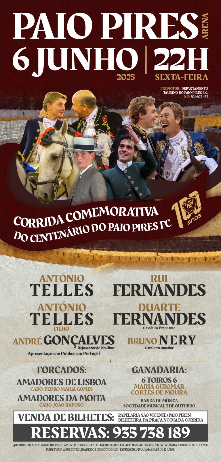 A arena de Paio Pires vai receber, no dia 6 de junho de 2025, às 22h, uma corrida de toiros comemorativa do centenário do Paio Pires Futebol Clube.