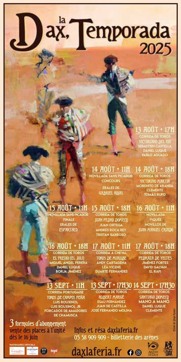 A cidade francesa de Dax já anunciou o cartaz completo para a temporada taurina de 2025. O ciclo contará com novilhadas, corridas de toiros à espanhola e uma corrida portuguesa. Um dos principais destaques vai para a presença dos cavaleiros portugueses Luís Rouxinol e Luís Rouxinol Jr, que atuarão na corrida portuguesa agendada para 13 de setembro, às 11h00, com toiros de Campos Peña e com a participação dos Forcados Amadores de Chamusca.