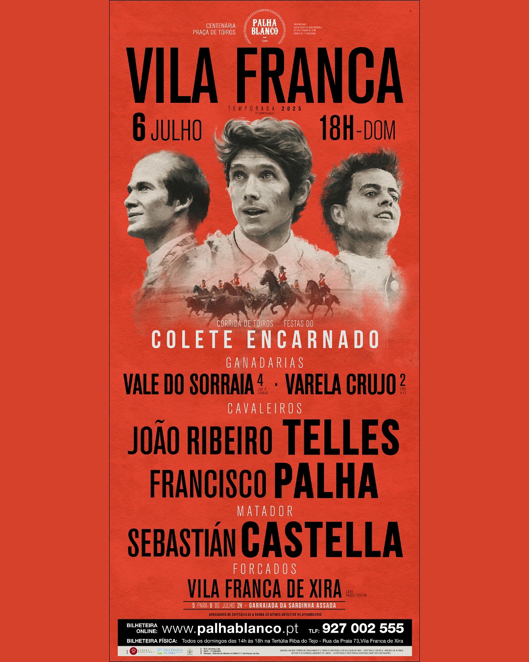 Frente a touros Vale Sorraia (lide a cavalo) e Varela Crujo (lide a pé), actuam João Ribeiro Telles, Francisco Palha e Sebastián Castella.