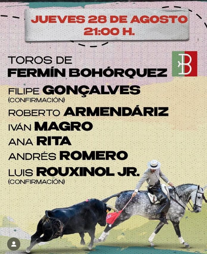 Frente a touros de Fermín Bohórquez, actuam Filipe Gonçalves, Roberto Armendáriz, Iván Magro, Ana Rita, Andrés Romero e Luís Rouxinol Jr.