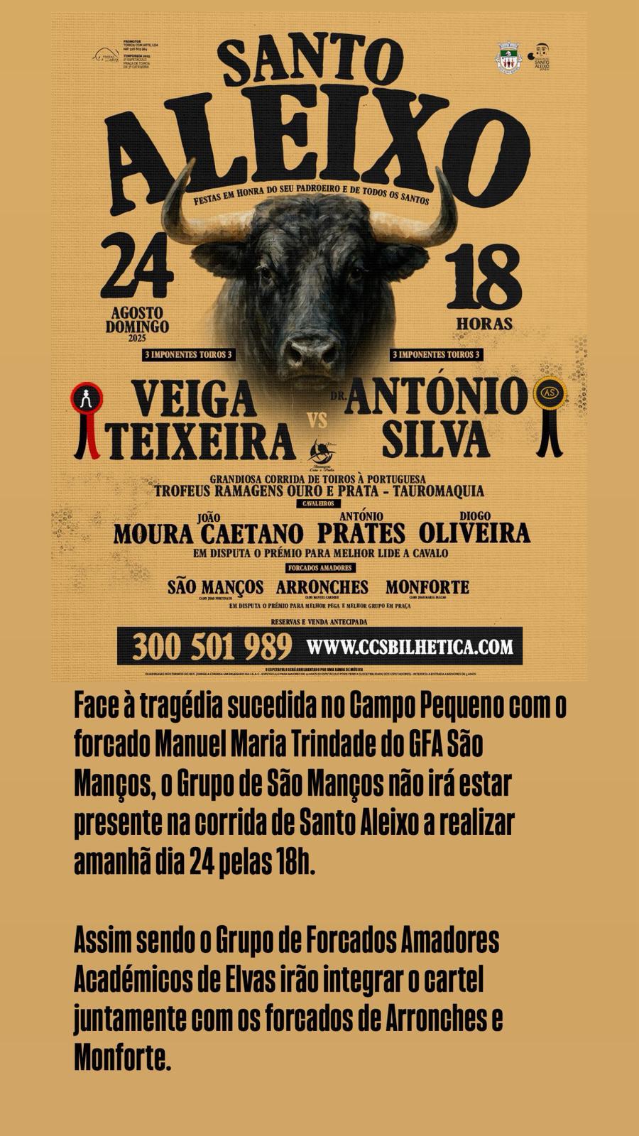 A decisão surge depois do falecimento de Manuel Trindade, de apenas 22 anos, que não resistiu aos ferimentos após uma pega no Campo Pequeno. A ausência do Grupo de São Manços em Santo Aleixo é vista como um gesto de luto e respeito pela memória do jovem forcado.