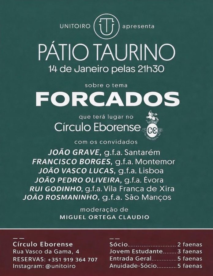 Segundo o comunicado de imprensa divulgado pela organização, “A UniToiro promove no próximo dia 14 de janeiro, pelas 21h30, mais uma edição do ‘Pátio Taurino’, que terá lugar no Círculo Eborense, em Évora”.
