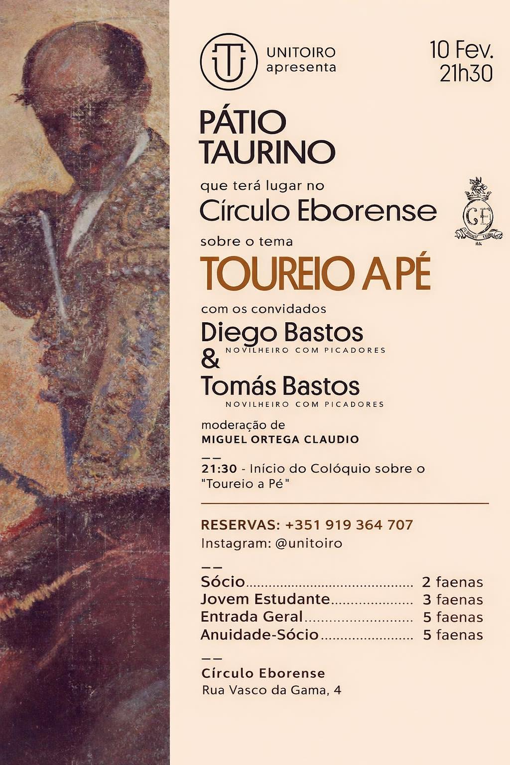 UniToiro promove colóquio do “Pátio Taurino” dedicado ao Toureio a Pé, em Évora, a 10 de fevereiro.