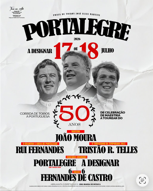 Portalegre vai receber uma corrida de toiros que assinala os 50 anos de alternativa de João Moura. O evento está anunciado para 17 ou 18 de julho de 2026, na Praça de Touros José Elias Martins.
