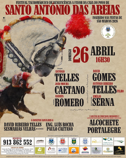 Desde logo, o cartel apresenta nomes conhecidos do público. Em praça estarão os cavaleiros António Telles, João Moura Caetano, David Gomes, Andrés Romero e António Telles filho.